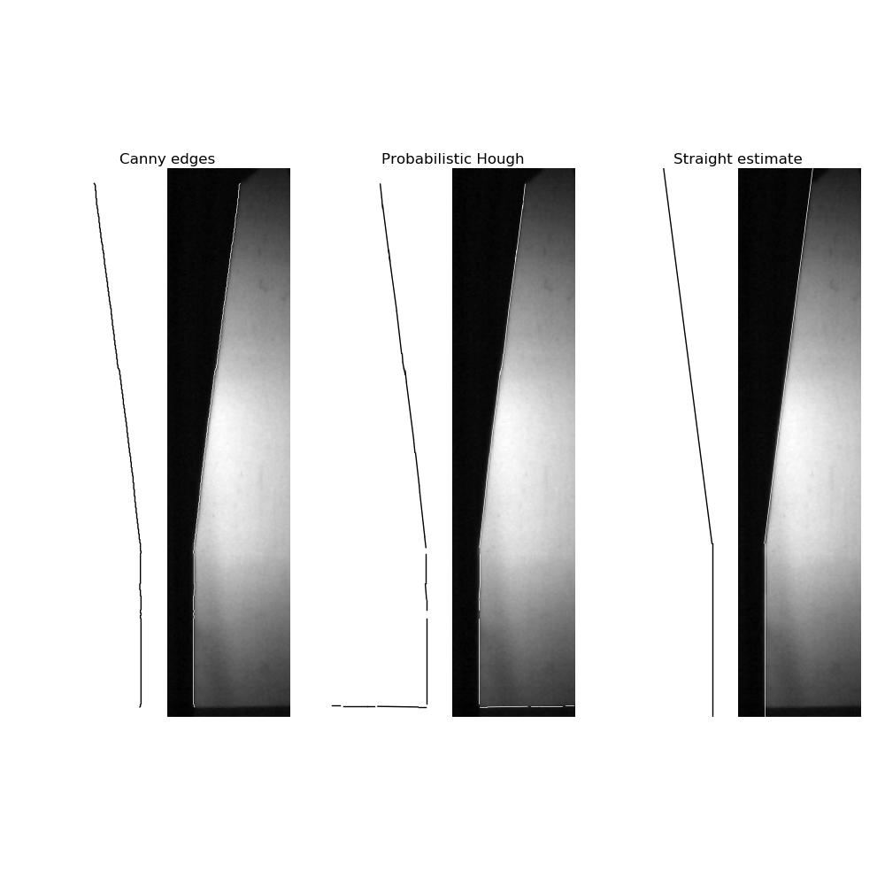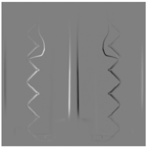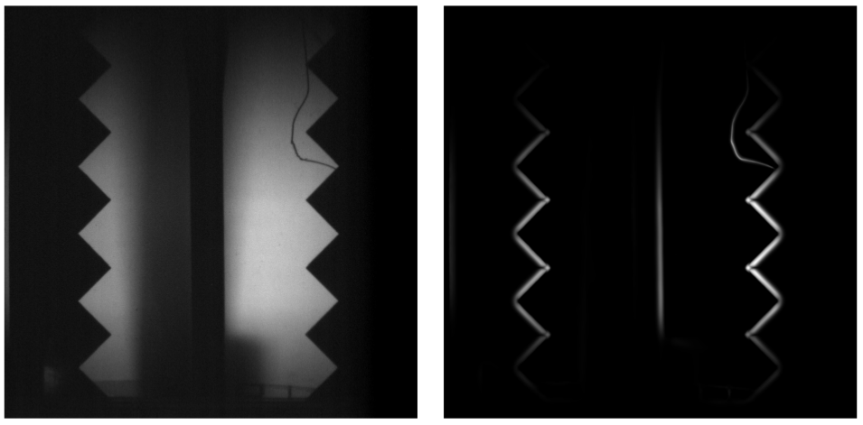 The sequences of cylinder test images are now registered to a template image so that they all line up. This is done using the Frangi [2] filter in the scikit-image [3] python module. The Frangi filter is used because of its ability to capture higher lever detail and edges. The filter applied to the first frame of a different experiment (left) results in the gradient image in on the right.