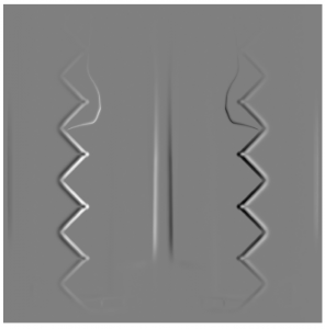 If all of the images in the stack are registered to the first frame, it is important that the first frame be symmetrical. To accomplish this the first frame is registered to its own vertical mirrored image. The rigid transform (rotate and translate) that results in the smallest norm should the pixel intensities of the marker sides be subtracted from its mirrored value is found using the downhill simplex algorithm in the scientific python module [4]. If the mirrored Frangi filtered image above is subtracted from the original, the resulting image is displayed below:
